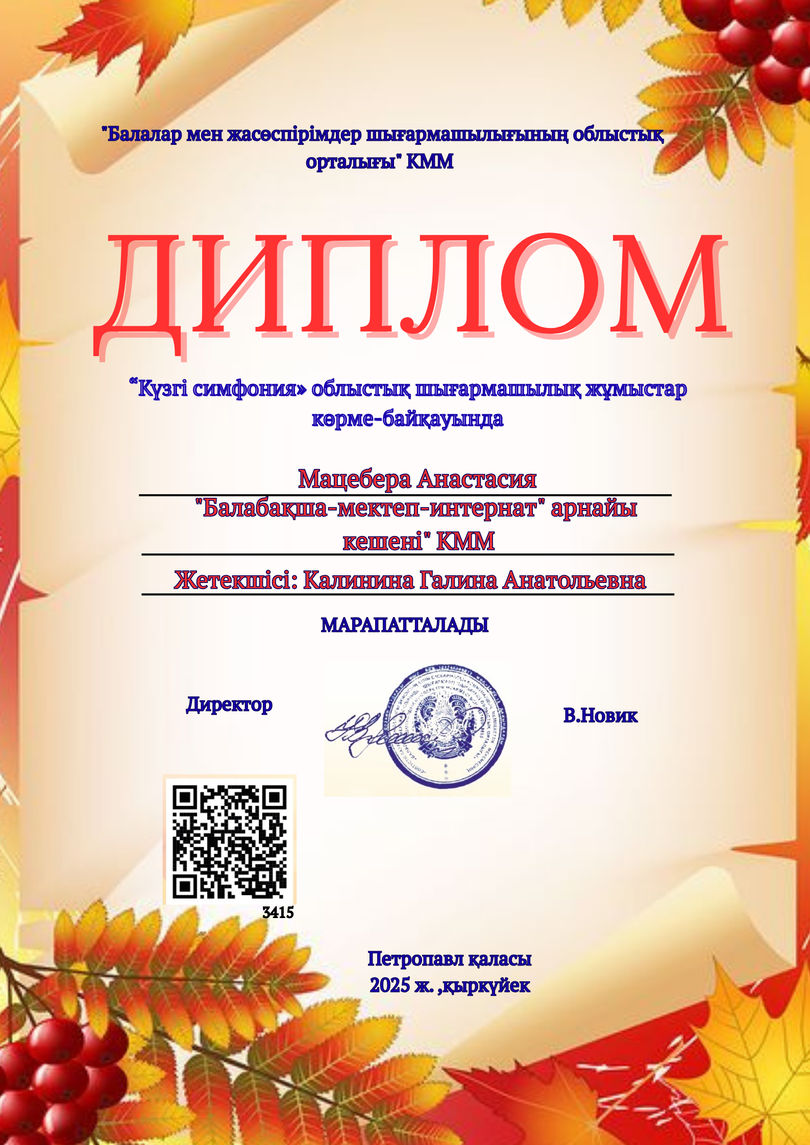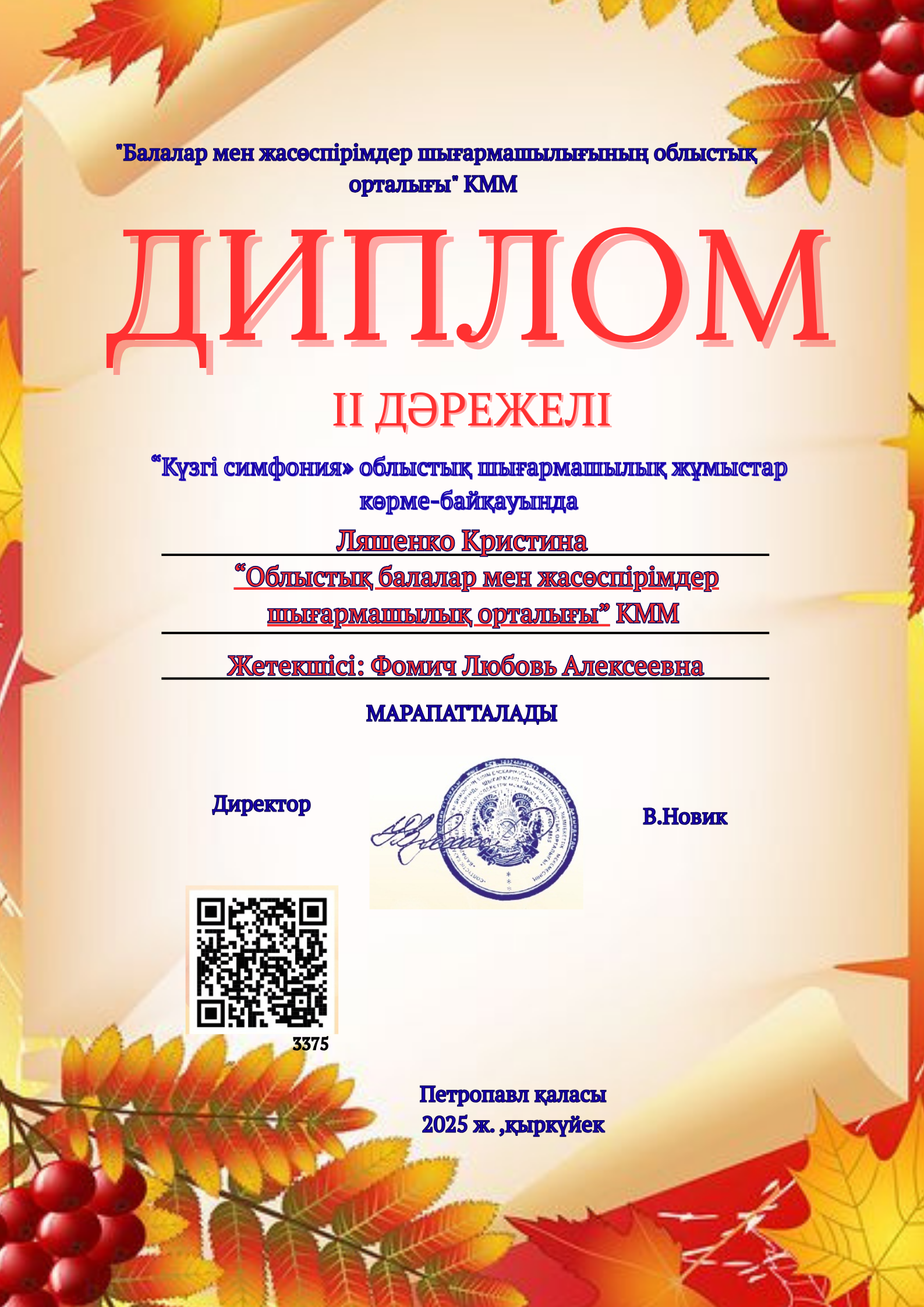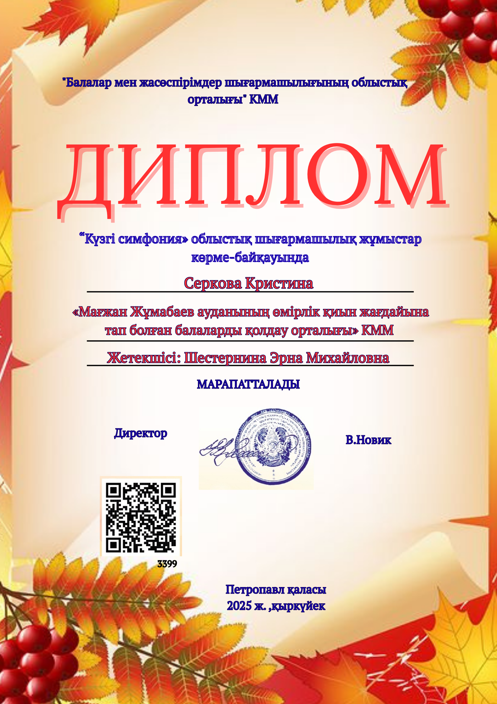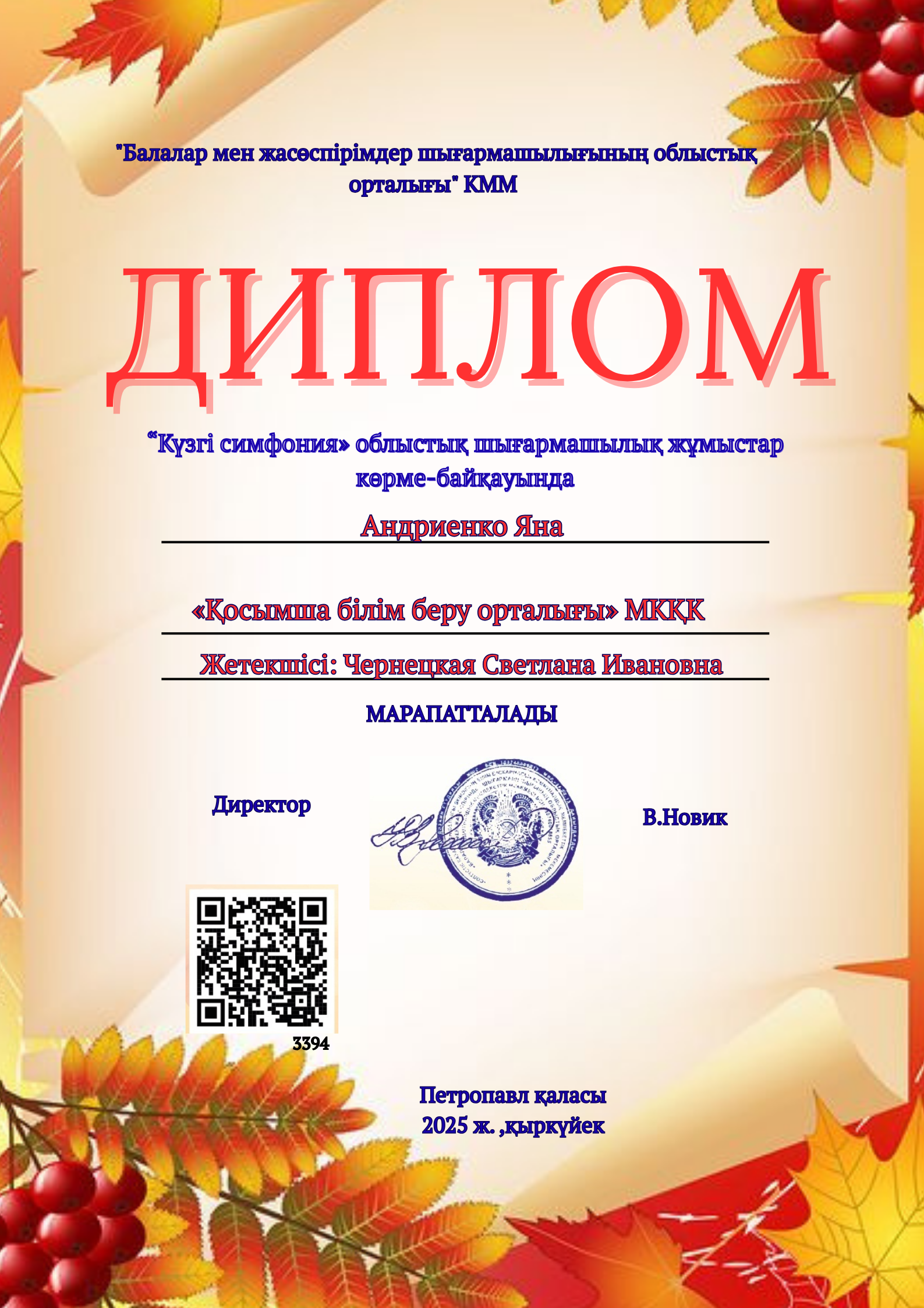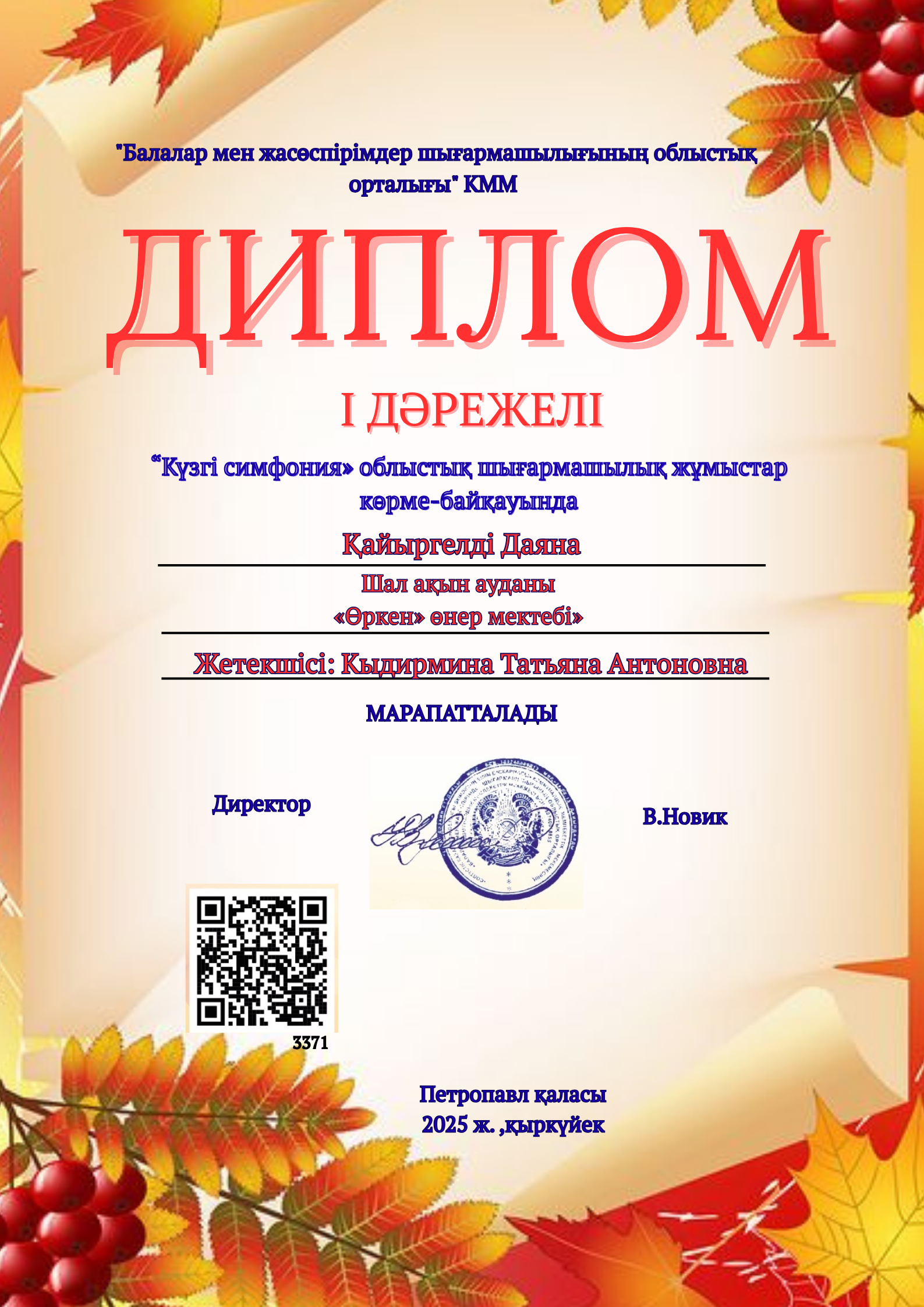 Қайыргелді Даяна,КГУ «Школа искусств «Өркен» КГУ «Отдел образования района Шал акына» КГУ «Управление образования акимата СКО».