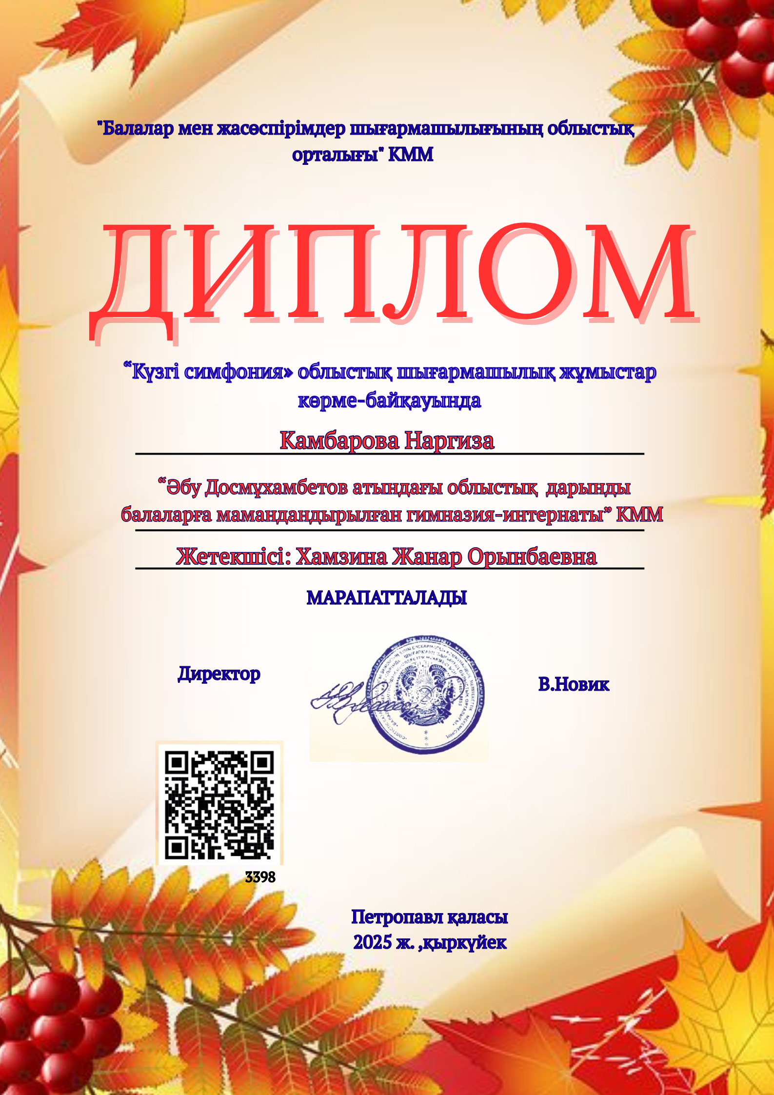 Камбарова Наргиза, КГУ "Областная специализированная гимназия-интернат для одаренных детей имени Абу Досмухамбетова".Рук. Хамзина Жанар Орынбаевна.