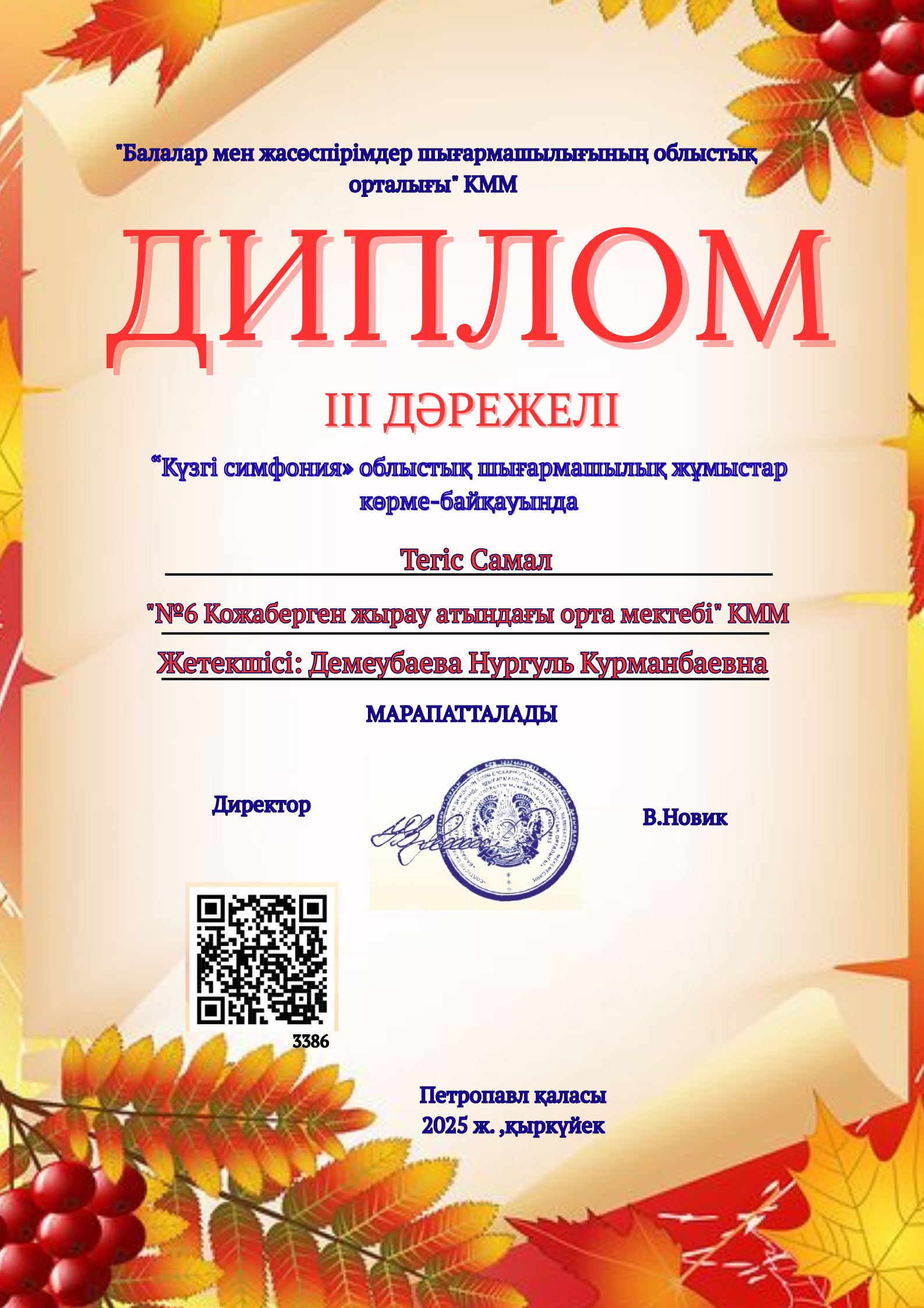 Тегіс Самал, КГУ «Средняя школа №6 им. Кожаберген жырау».