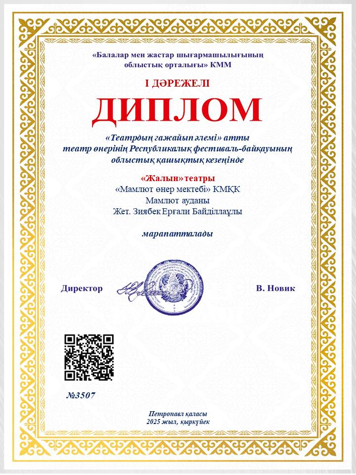 - Театр «Жалын», КГКП «Мамлютская школа искусств», Мамлютский район, рук. Зиябек Ерғали Байділлаұлы.