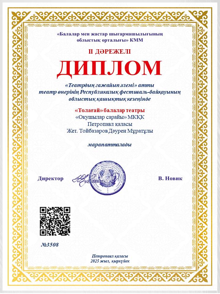 - Детский театр «Толағай», ГККП «Дворец школьников», город Петропавловск, рук. Тойбазаров Дәурен Мұратұлы.