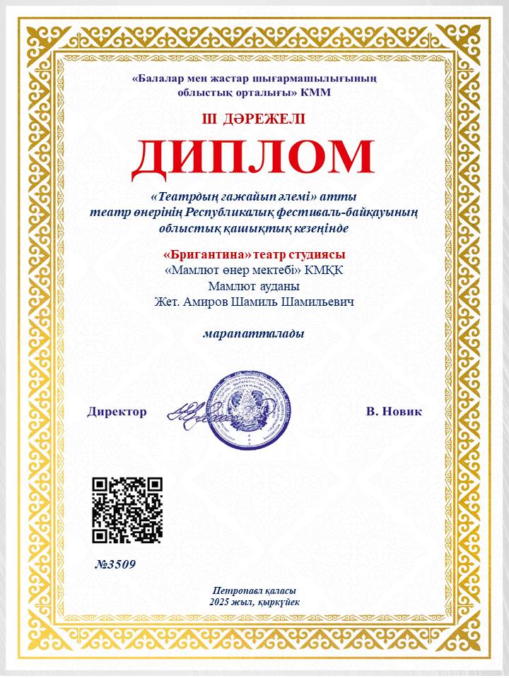 - Театральная студия «Бригантина», КГКП «Мамлютская школа искусств», Мамлютский район, рук. Амиров Шамиль Шамильевич.